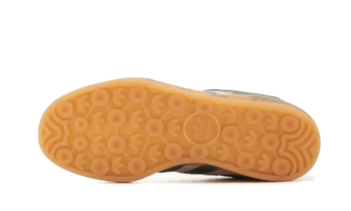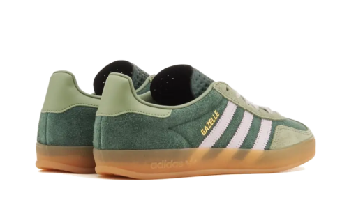 The Adidas Gazelle Indoor Mineral Green Silver features a suede base in various shades of green, accentuated by white details on the laces and the iconic three Adidas stripes. The gum outsole adds the perfect finishing touch to the silhouette.