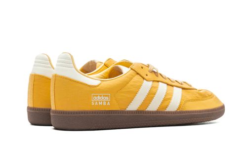 The adidas Samba OG Reflective Nylon Oat features a yellow nylon base, complemented by a matching mudguard. White details like the “Samba” on the back of the silhouette enhance the upper, along with the three stripes and heel tab. To top it off, a gumsole completes this pair.
