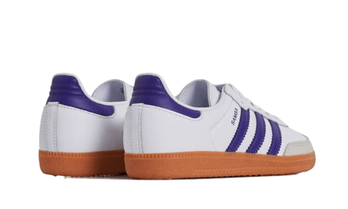 Timeless design originally created for football, the Samba makes a comeback in a clean colorway. The adidas Samba OG White Energy Ink Gum features a white leather base with a beige suede mudguard. The leather three stripes are in a purple hue, matching the heel tab and branding on the side panel and tongue. To top it all off, a gumsole completes this pair. This streetwear icon will delight fans of its retro style and silhouette.