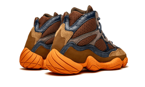 The Adidas Yeezy 500 High Tactile Orange features a brown upper with navy blue overlays, staying true to the dad shoe style and the characteristics of the model that inspired it. This new creation boasts a bold orange outsole equipped with adiPRENE technology, adding the final touch to the Chicago rapper’s design.