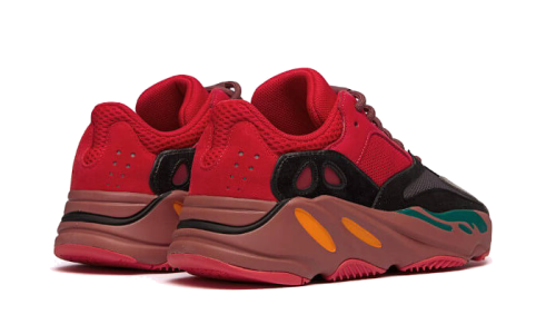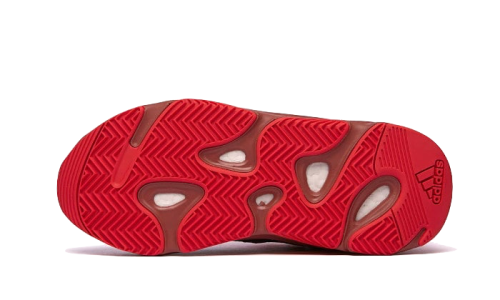 The Adidas Yeezy 700 Hi-Res Red features a striking red leather base complemented by premium grey suede overlays. Multiple mesh details run throughout the design by Steven Smith. A burgundy sole with colorful engravings completes the aerodynamic look of the silhouette.