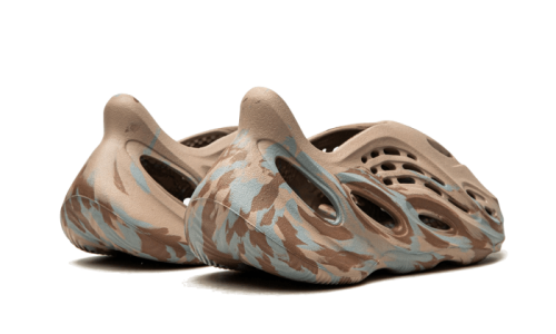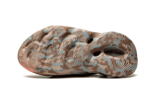The Adidas Yeezy Foam RNNR MX Sand Grey features a brown EVA molded structure, adorned with marbled patterns in blue, pink, and chocolate hues blending along the upper. The silhouette is adorned with perforations adding to its avant-garde design.