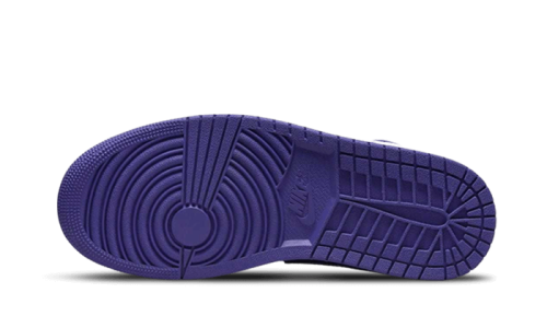The Air Jordan 1 Mid Purple Black showcases a foundation made of black leather, accented by panels of rich purple leather. A aged white midsole enhances the nostalgic vibe of this design, while the purple outsole complements the upper’s overlays beautifully.