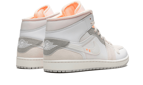The Air Jordan 1 Mid SE Craft Inside Out White Grey features a mixed structure of white leather paired with elements of grey suede. The foam tongue and laces showcase a beige hue, giving a vintage touch to the silhouette. Two orange embroideries enhance the lateral swoosh blending with the Wings panel on the heel. A cream sole with a weathered look completes the revamped design.
