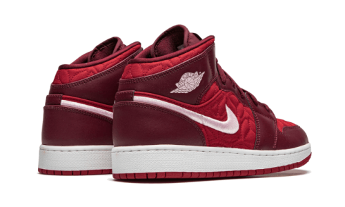 The Air Jordan 1 Mid SE Red Quilt features an upper that skillfully combines dark red leather panels with light red fabric accents. It showcases the signature branding, including a white swoosh that is intricately woven and the iconic Jordan Wings Logo, also in white. The look is completed with a crisp white sole, elegantly contrasted by a red outsole.