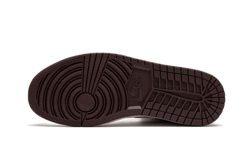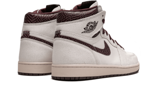The Air Jordan 1 Retro High OG A Ma Maniére showcases a base in off-white suede leather, elevated by color accents ranging from burgundy to brown. The same panels feature a snakeskin pattern. A cream-colored midsole adds to the vintage look of the model.