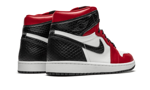 The Air Jordan 1 Retro High Satin Snake Chicago features a leather base with white panels on the quarter panel and toebox, black accents on the ankle, Swoosh, and heel, and red highlights on the rest of the upper. A Snakeskin finish on the black parts gives it a trendy look, while black laces, a two-tone sole, and various branding elements complete the design with elegance.