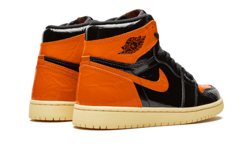 After the initial release in 2015, revisited in 2016, and later transformed into a satin version, the model is returning with the Air Jordan 1 Shattered Backboard 3.0. Featuring a crushed patent leather construction in black, accented with orange details on the toe box, swoosh, and heel. All sitting atop a beige sole.