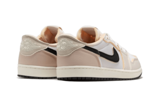 The Air Jordan 1 Retro Low OG EX Coconut Milk features a white canvas base, accented with beige canvas overlays, a black Swoosh, and a beige suede heel tab. This silhouette stands out with its unique deconstructed finishes for a raw effect.