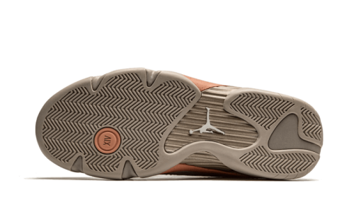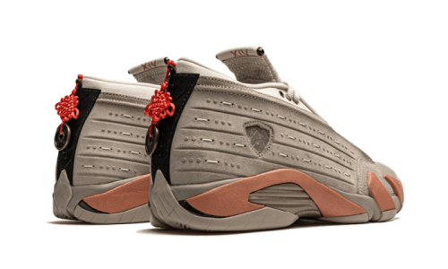 The Air Jordan 14 Retro Low Clot Terra Blush features a gray base mixing leather and suede. Several orange accents on the midsole and outsole elevate the overall look. The Jumpman logo is discreetly placed on the outsole. The inscriptions “JORDAN” and “CLOT” can be found on the tongue, along with the number 14 written in Roman numerals.