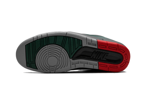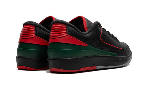The Air Jordan 2 Retro Low Christmas features a black leather base with red and green accents. The red Wings logo on the tongue matches the TPU heel tab, while the sole consists of a black midsole and a grey, green, black, and red outsole.