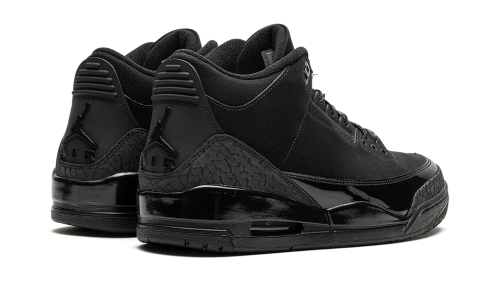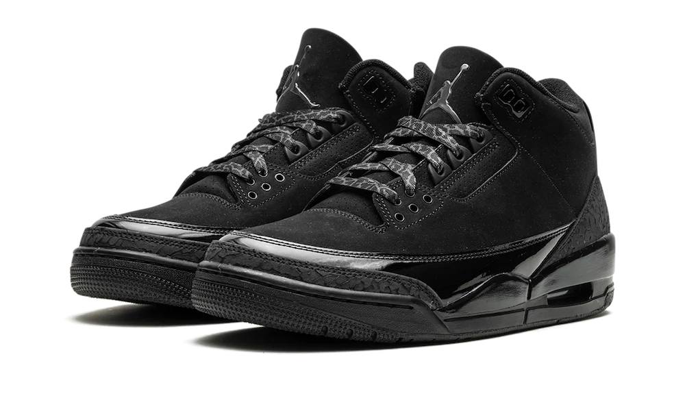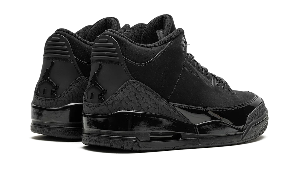 The Air Jordan 3 Black Cat (2025) boasts a stunning black nubuck upper, complemented by sleek tonal black patent leather accents. The signature Elephant Print pattern is featured prominently on the heel, adding a classic touch. Finished with a sole that showcases the famous air cushioning, this shoe combines style and comfort flawlessly.