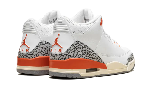 A flagship model from Jordan Brand, the Air Jordan 3 Georgia Peach is making a comeback in a new, light colorway. This sneaker features a white leather base, complemented by grey elephant print panels and peach-colored accents. Bright orange details add a pop of color to this iconic silhouette, highlighted by a purposely aged sole for a vintage touch.
