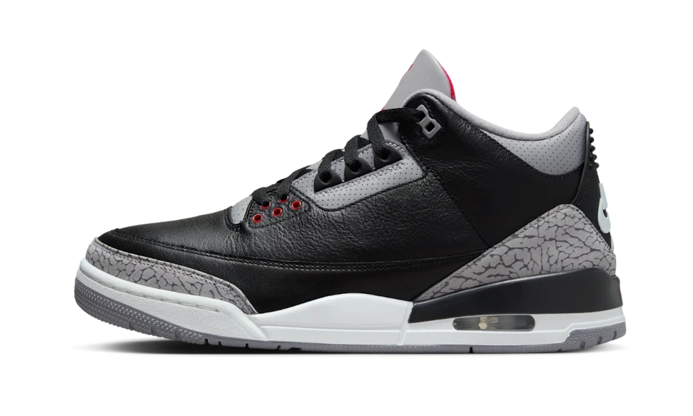 The Air Jordan 3 Retro Black Cement features the signature black leather upper, complemented by gray leather accents adorned with the iconic Elephant Print pattern. This nearly all-black aesthetic adds a touch of understated elegance to your outfits. A striking white sole enhances the overall design, providing a fresh contrast that elevates the entire look.