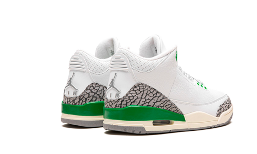 The Air Jordan 3 Retro Lucky Green features a pristine white leather foundation, complemented by overlays adorned with the iconic elephant print trademark of Jordan Brand. Splashes of green are incorporated through TPU detailing on the heel and eyelets, while the red Jumpman logo on the tongue adds a vibrant pop to the overall design.