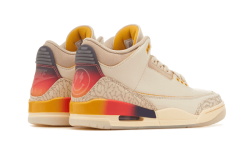 After the release of the iconic AJ1 and AJ2, J Balvin and Air Jordan are teaming up once again for a new collaboration, this time on the Air Jordan 3. The Air Jordan 3 Retro SP J Balvin features a cream leather base with yellow accents on the eyelets and a grey elephant print panel. Inspired by the reggaeton star’s iconic style, this silhouette showcases a multicolored TPU heel adding a unique touch to the design.