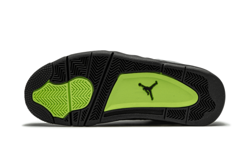 The Air Jordan 4 Neon Volt showcases an upper crafted from various shades of gray, highlighted by the iconic eyelets featuring vibrant fluorescent green and yellow accents typical of the Air Jordan 4. The sneaker is adorned with the Jordan logo on the tongue and the Nike Air emblem in black at the heel, adding a touch of classic branding.
