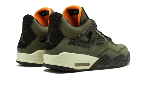 The Jordan 4 Retro Undefeated Deep Green is distinguished by its combination of nubuck and textile material, featuring a stylish khaki base accentuated with black and orange highlights. The branding from both entities is tastefully integrated. Its monochromatic midsole provides a cushioning system enhanced with Air, ensuring maximum comfort and a smooth ride.