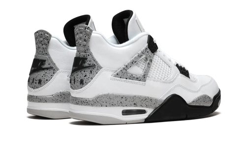 The Air Jordan 4 Retro White Cement is distinguished by its white leather construction, complemented by striking black and grey accents, featuring speckled patterns throughout. The bold red Jumpman logo on the tongue and the classic “Nike Air” branding on the heel lend a finishing touch to this silhouette, creating a harmonious blend of contemporary and vintage flair.