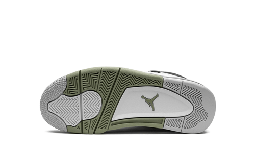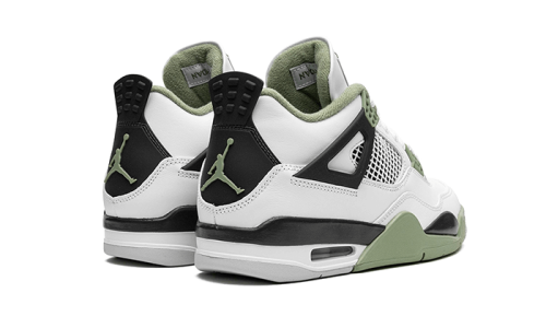 The Air Jordan 4 Seafoam features a white leather upper with black detailing on the flaps and heeltab. The TPU cage is prominently displayed on the lateral panel in a white shade. Light green accents can be found on the midsole, TPU eyelets, brandings, and lining.