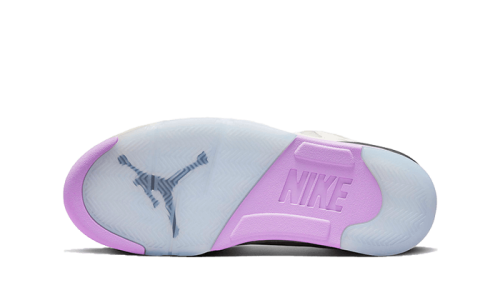 The Air Jordan 5 DJ Khaled Sail features a base in off-white leather, complemented by the iconic TPU cage. The “We the best” inscription on the heel references the music label created by the American DJ. A padded and sky blue satin lining corresponds to the shark teeth effect on the sole, while a purple accent on the midsole adds a finishing touch.