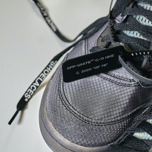 This Air Jordan 5 Retro Off White Black features a detailed style, with a gray TPU upper. On the black laces, you will find the inscription “SHOELACES”, a signature Off-White detail symbolic of this collaboration. Other distinctive elements include two circles attached, a reflective tongue, and the “Nike Air” logo on the heel. The yellowed sole adds a touch of color and completes the pair’s design.