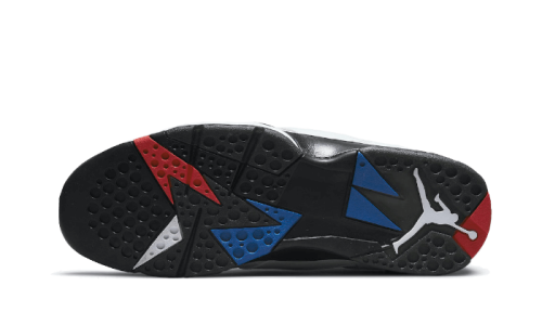 The Air Jordan 7 Retro Paris Saint-Germain features a mostly white leather overlay construction. This dynamic is broken up by the addition of a mesh panel revealing hints of blue and red, reminiscent of the PSG colors. These colors are also visible on the tongue and the heel, which showcases the club’s logo represented by a fleur de Lys. Finally, the “Paname” tag on the outer sides and the rallying cry “Ici c’est Paris” on the insoles complete the look.