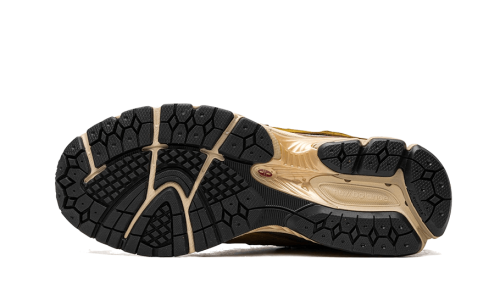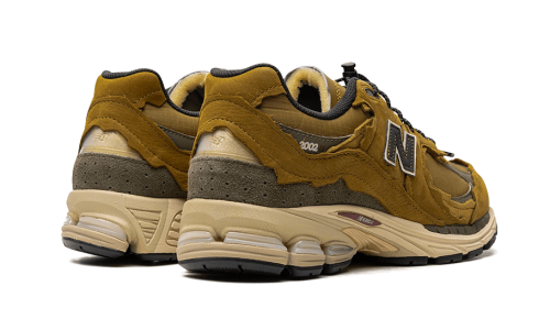 The New Balance 2002R Protection Pack High Desert features a blend of mustard yellow mesh, gray leather, and slightly darker yellow suede on the upper. The New Balance logo is in gray. It also includes a lock lace closure for easy wear and better support. The yellowed sole combines N-Ergy and ABZORB technologies to complete the look.