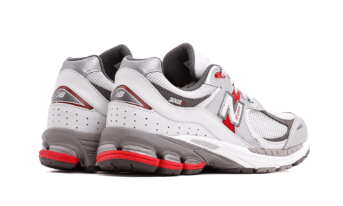 The New Balance 2002R Silver Metallic features a blend of materials, showcasing a top layer made of gray mesh complemented by overlays of white leather. Silver accents trace the front design of this running shoe, adding a touch of elegance to its aesthetic. Additionally, splashes of red appear both on the upper and the ABZORB sole, enhancing the overall appeal of this iconic silhouette.