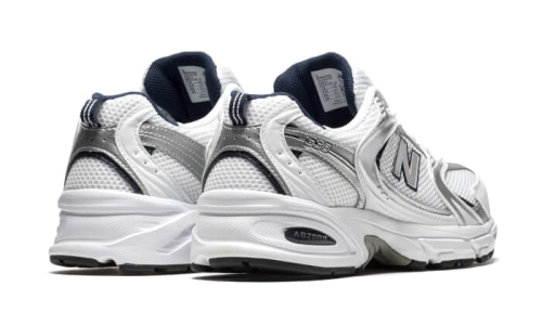 The New Balance 530 White Grey features a mesh upper for maximum lightness, sitting on a sole with Abzorb technology for added comfort. The color scheme is predominantly white, with hints of grey and blue for a sleek and sleek look.