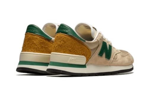 The New Balance 990 v1 Made In USA Tan Green showcases a light brown mesh base complemented by smooth, tonal suede overlays. A plush brown nubuck panel reinforces the heel, and fresh accents of rich pine green can be found on the collar and the iconic “N” on the side.