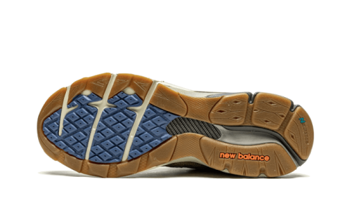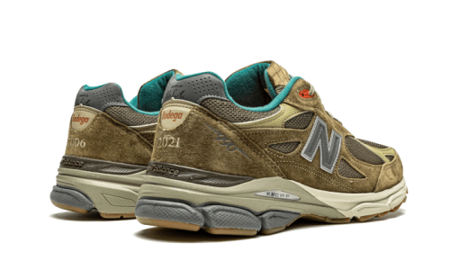The New Balance 990 v3 Bodega Here To Stay features a top-tier build with an upper combining suede and mesh materials. This running shoe showcases a sophisticated neutral color scheme, blending hues of khaki, beige, and brown, which beautifully complements the grey N logo. Additionally, vibrant accents like an aqua lining and orange eyelets add a stylish flair to the overall design.