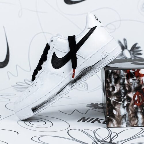 The Air Force 1 Low G-Dragon Peaceminusone Para-Noise White features a leather upper covered in a layer of white. These white panels reveal a hidden, more vibrant pattern as they wear over time… It’s up to you to distress the parts you want to make your model unique. The traditional branding is present with the black side swoosh and AIR on the sole. Signs of wear and tear and black laces contrast the silhouette.