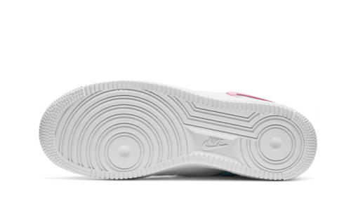 The Nike Air Force 1 LXX White Pink Aqua showcases a timeless white leather base. Its unique deconstructed Swooshes—one in pink leather on the left side and another in turquoise on the right—add a playful touch, while the visible Nike branding on the tongue brings a technical flair. A notable detail of this model is the exterior tongue featuring the Swoosh, positioned on the inner section of the tongue.