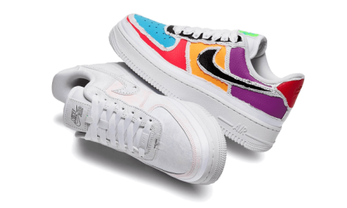 The Nike Air Force 1 Low Tear Away Sail initially appears as a simple white fabric base that reveals a vibrant premium leather upper once the tear-away panels are removed. A subtle “Tear Away” inscription prompts the owner to uncover a black swoosh and eyelets, a green tongue, a mix of red, yellow, and purple on the upper, and a blue toebox. Lastly, the classic sole with Nike AIR technology completes the look.