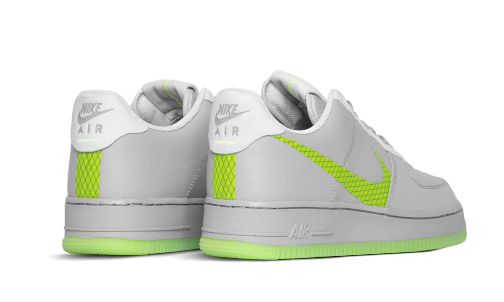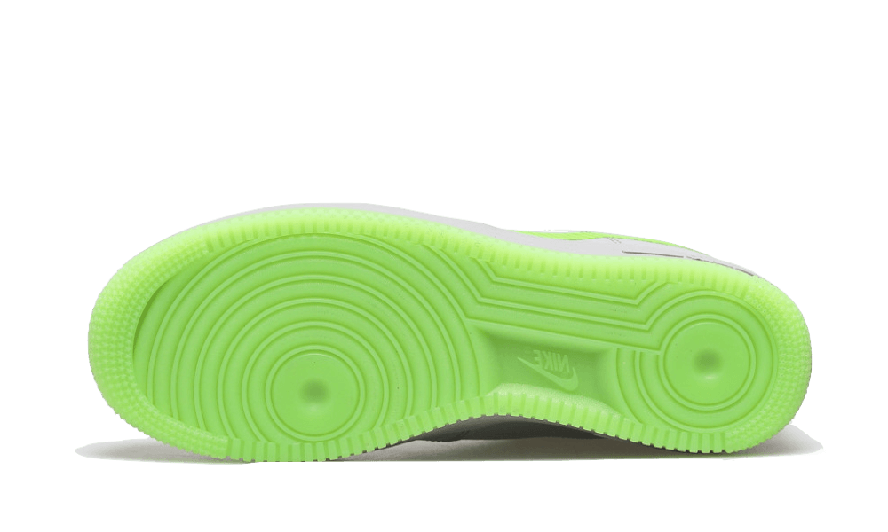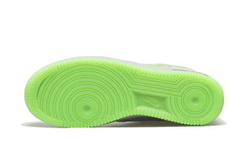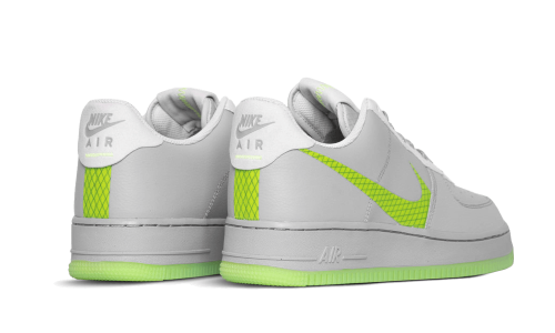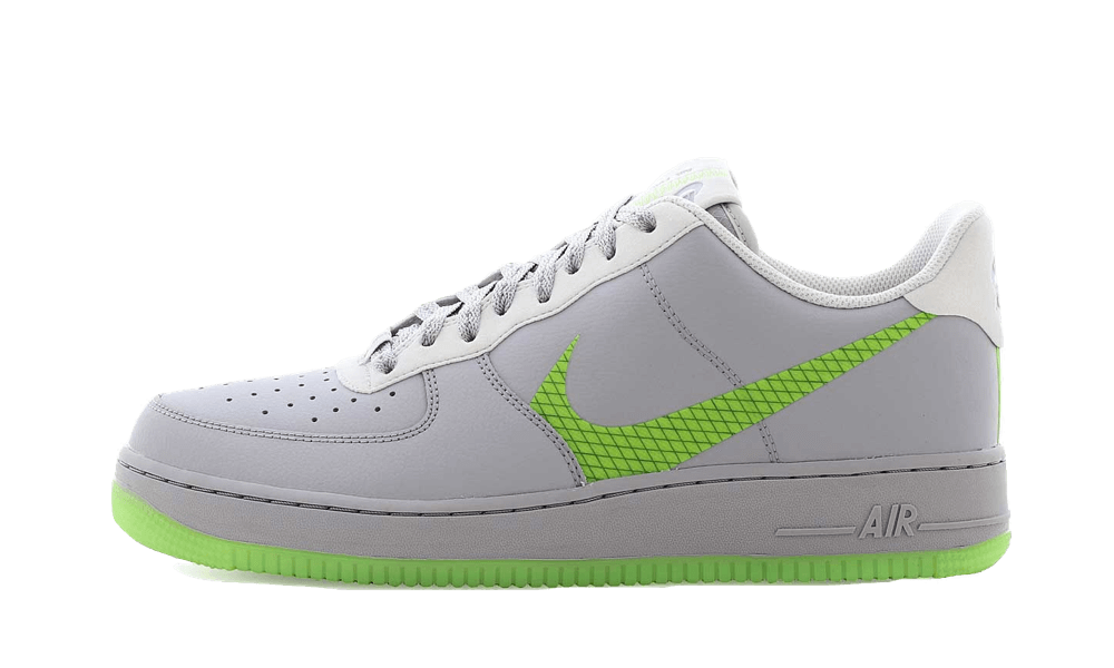 The Nike Air Force 1 Low Wolf Grey Ghost Green features a sleek gray leather upper, accented by a vibrant neon green swoosh that creates a striking contrast. This swoosh is positioned lower than usual, contributing to a trendy deconstructed aesthetic that has garnered much attention. Additional light gray leather panels around the laces and heel, along with a sole in the same eye-catching green, complete the overall look.