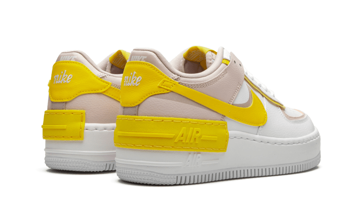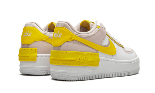 The Nike Air Force 1 Shadow Speed Yellow embraces the iconic construction characteristic of the Shadow variations, highlighted by the signature double-layered elements such as the swoosh and eyelets. This model showcases a pristine white leather base that is beautifully accented with yellow on the swoosh and the layered heel panel. Creamy brown touches on the toebox and heel provide an elegant finishing detail.