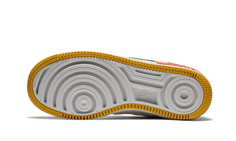 The Nike Air Force 1 Shadow White Flash Crimson Astronomy Blue features a premium leather upper. Its dual blue and crimson pink swooshes, along with the AIR branding logo on the back of the shoe, add a technical and deconstructed flair. The yellow outsole contrasts with the design, resulting in a surprising and contemporary look.