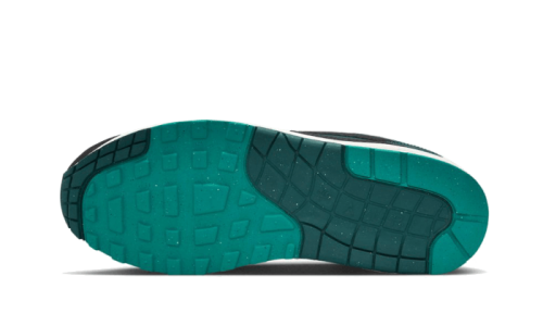 The Nike Air Max 1 Liverpool Lebron James features a white mesh base with emerald green leather overlays. Some black leather details cover the mudguard and the lateral swoosh. A red lining matching the Air unit of the sole completes the design.