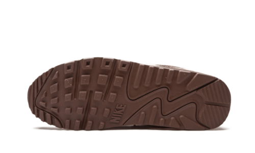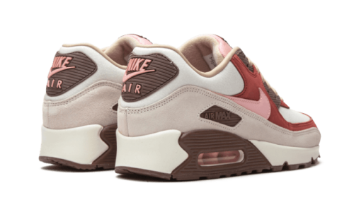 The Nike Air Max 90 NRG Bacon (2021) features a combination of leather, suede, and suede in the signature bacon color scheme. It includes a mesh tongue and TPU panels. The reissue is completed with a white midsole and brown outsole.