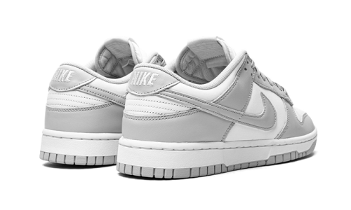 The Nike Dunk Low Grey Fog features the usual white leather upper, accented with light grey leather overlays. The exposed stitching adds a touch of retro style. The color scheme extends to the soles of the silhouette, with NIKE branding on the tongue completing the look.