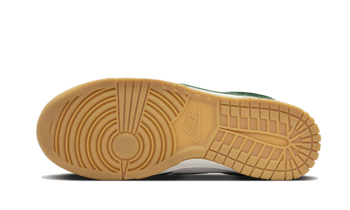 The Nike Dunk Low LX Gorge Ostrich showcases a striking foundation crafted from white leather, complemented by overlays of textured and glossy green leather. The embossed Nike branding on the heel tab seamlessly blends into the design, while the gold-accented tag on the tongue harmonizes beautifully with the outsole, elevating the overall aesthetic with a touch of luxury.