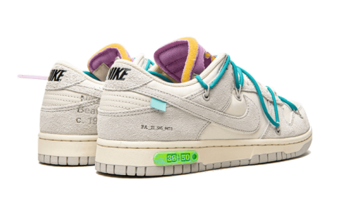 The Nike Dunk Low Off-White Lot 36 draws inspiration from the Dunk High Sail Neutral Grey released in 2008, featuring a stylish blend of gray and cream tones. Its design highlights luxurious materials, including long-haired suede and premium leather. The creativity of this colorway is accentuated by the striking blue laces, the eye-catching tongue, and the distinctive purple zip tie, which collectively elevate its aesthetic.