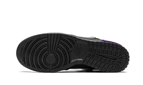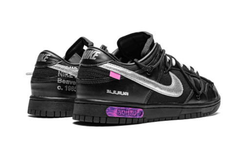 The Nike Dunk Low Off-White Lot 50 features an upper made of black leather, layered with black canvas accents. A silver swoosh is also present, along with the signature Off-White industrial details, and a purple numbering plate on the midsole.