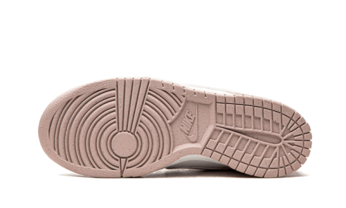 The Nike Dunk Low Pink Velvet showcases a smooth white leather upper, complemented by light pink leather overlays on the eyelets and mudguard. The tongue and heel counter also feature accents of red. A slightly pink-tinted outsole paired with a white midsole completes the design.
