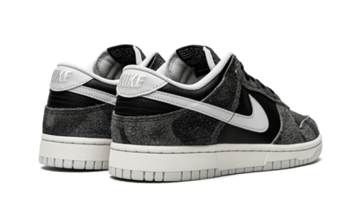 The Nike Dunk Low PRM Animal Pack Black features a smooth black leather construction, complemented by anthracite suede overlays. White accents on the Swoosh and collar add contrast to the design. Nike branding on the tongue and heel tab provide the finishing touches.