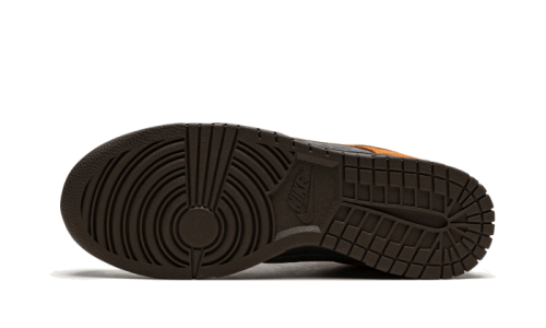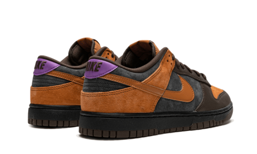 The Nike Dunk Low PRM Cider features a combination of smooth leather and suede on the upper, with alternating panels in a fall color palette of rich chocolate brown, ochre brown, and black. Accents of purple on the heel and tongue add an ACG touch. A two-tone black and brown sole completes the look.