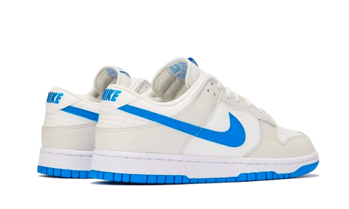 The Nike Dunk Low Retro Photo Blue features a crisp white leather upper, complemented by delicate overlays in light grey leather. The iconic Swoosh introduces a splash of color and contrast, harmonizing beautifully with the outsole and branding elements.