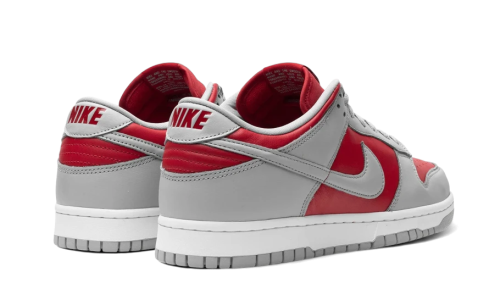 The Nike Dunk Low Reverse Ultraman features a red leather base accentuated by gray leather overlays on the upper and side panels, paying tribute to the legacy of the famous Japanese superhero Ultraman. A rubber outsole ensures optimal traction, blending style and history in a classic silhouette.