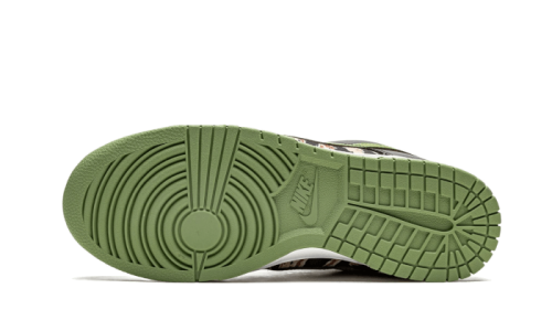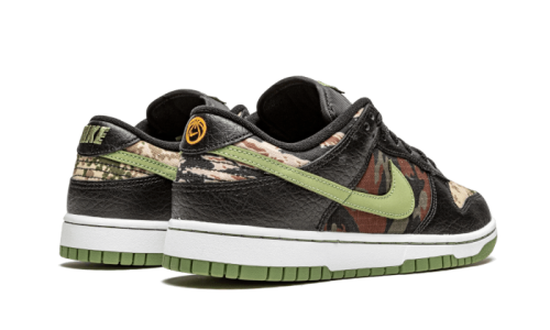 The Nike Dunk Low SE Black Multi-Camo (Crazy Camo) showcases a striking blend of mismatched designs featuring an array of camouflage patterns. It incorporates black leather panels, a crisp white midsole, and a distinctive central swoosh in green, harmonizing beautifully with the sole.
